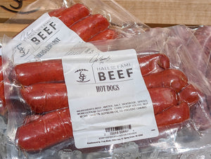 Hall of Fame Premium Beef Hot Dogs Ingredients: Beef, water, salt, dextrose, spices, monosodium glutamate, corn syrup solids, no more than 1% soybean oil to prevent caking.